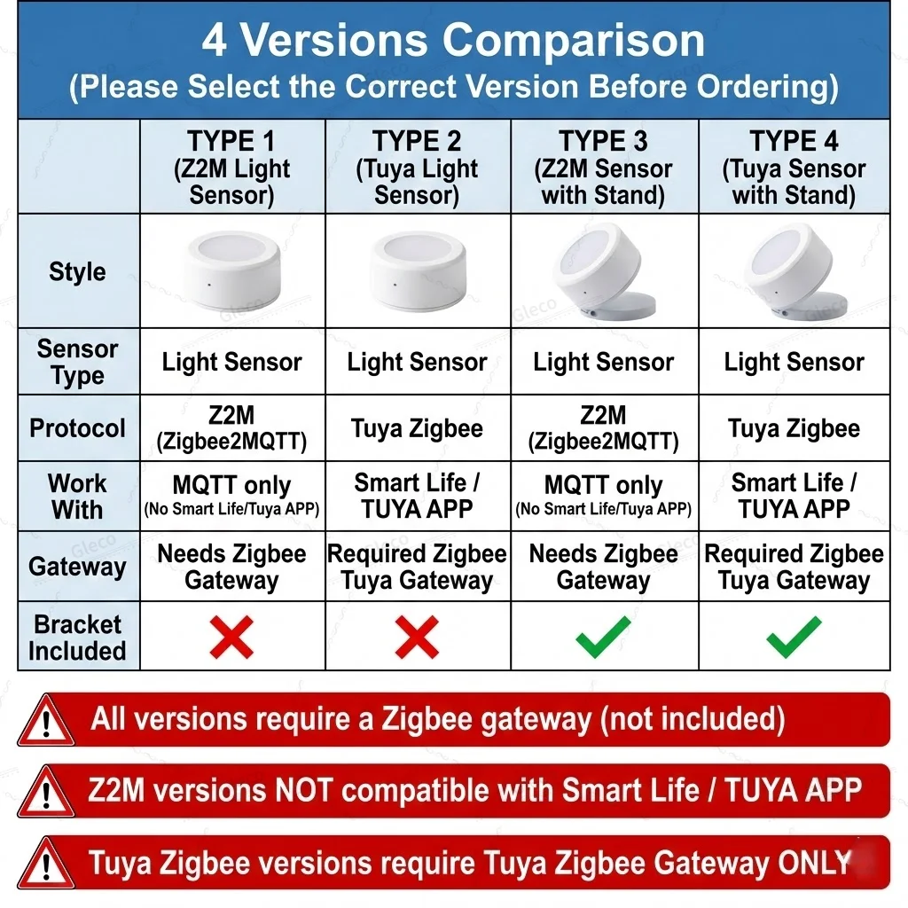 We offer 4 different models, all requiring a Zigbee hub. Please review the differences carefully to select the right version for your setup.